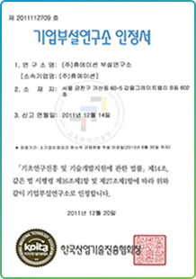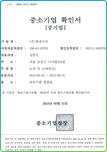휴에이션은 지속적이고 영속적인 기업 성장과 유지를 위해, 당사 CI 및 서비스 등에 대하여 특허 출원과 기술 개발 특허 출원을 하였습니다. 또한 2015년 부터는 소기업을 탈피하여, 중소기업청으로 부터 중기업 확인서를 인증 받았습니다.