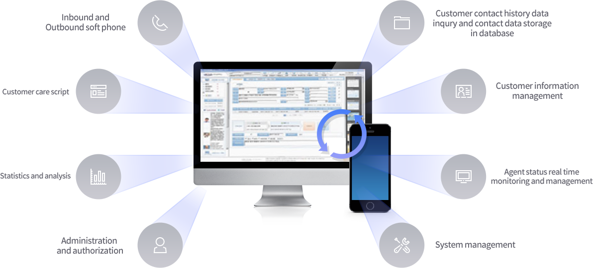 휴아이씨는 TSAPI/TAPI 프로토콜을 지원하는 모든 국내/외 교환기에서 운영이 가능한 CTI(Computer Telephony Integration) 미들웨어입니다. 고객센터 어플리케이션 화면에서 사용하는 소프트폰 툴바 뿐만아니라 UC와의 연동을 통해 Click to Dial 기능과 XML Push를 통한 전화기 액정상에 고객정보 및 인사정보를 Push 해줄 수 있습니다.